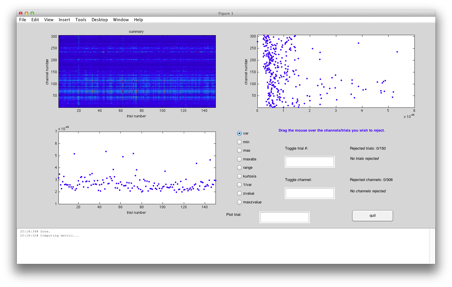 In the 'summary' view (check out documentation for other viewing options) you can see three figures. The outer right displays the relevant metric (default is variance, but you can choose within the window) for each channel across the entire epoch (see comment on choosing relevant periods above). In the lower panel the same metric displays the metric for all trials. The upper left figure is then the channel x trial depiction in color coding.
