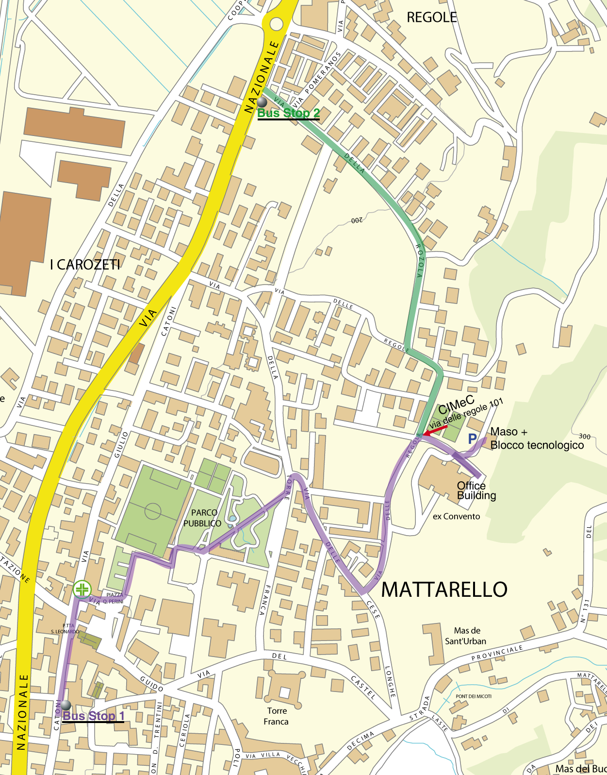 Mattarello is located 3 km from Trento center and 10 minutes from the highway exit. Leave the A22 Brenner highway at the "Trento Centro" exit and join the ring road in the direction of Verona (2nd exit on the right), therefore going South (Sud). After about 4 Km take the first exit for Mattarello and you will come to a crossroad where you will take a left (over the highway). At the stop sign you will take a left on to Via Nazionale, going north. After about 600 meters you will take a right onto Via della Rozola (opposite from "La Cicogna" store). From here follow the road (keeping to your left) all the way up to CIMeC which will be on the left. See driving map for further details. Parking can be found outside of the main offices.